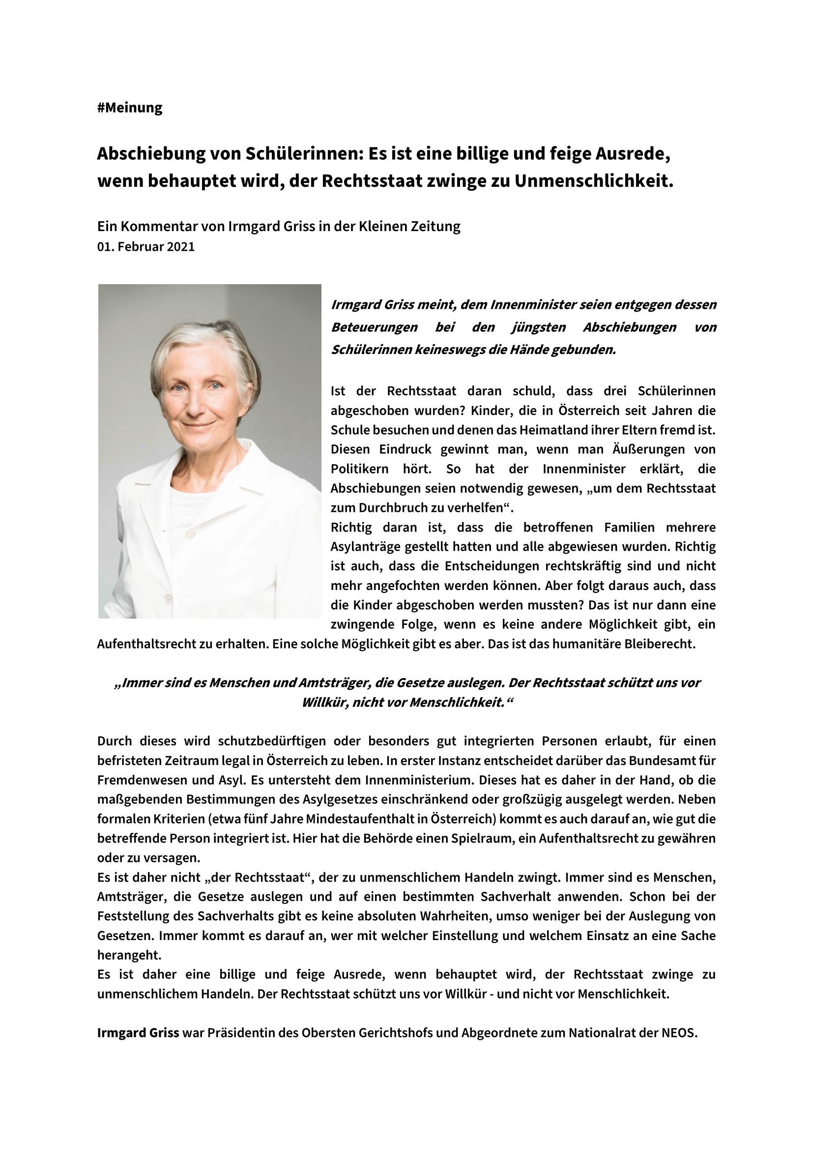 Am 2622019 teilt der Schwechater Gemeinderat Wolfgang Zistler auf seinem Facebook-Profil 952 Abonnenten einen Artikel eines rechten Hetzportals in dem es um eine Aussage der Ex-OGH-Präsidentin und NEOS-Abgeordneten Irmgard Griss im Rahmen einer Talkshow bei ServusTV zum Thema Migration geht. 112 Richard Lugner Unabhängig. Irmgard Griss also known as Irmgard Griss-Reiterer born 13 October 1946 is an Austrian politician lawyer and judge who served as President of the Supreme Court of Justice from 2007 to 2011.
